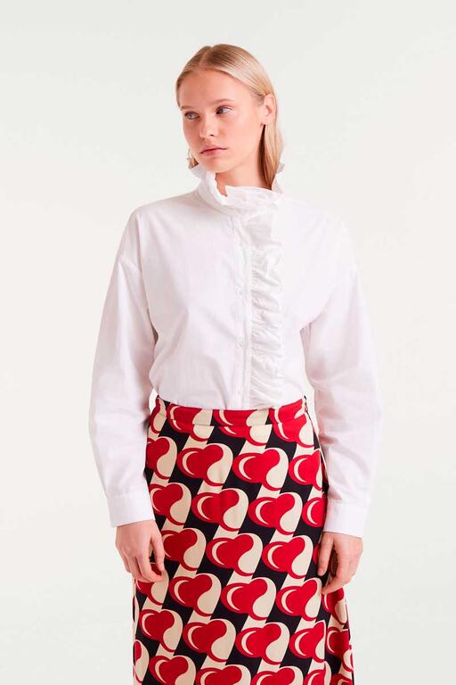 Camicia bianca in 100% cotone con collo alto con volant e maniche lunghe con polsini abbottonati. Chiusura frontale con bottoni e dettagli arricciati. La modella è alta 174 cm e indossa una taglia S.