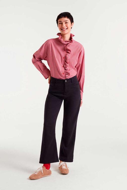 Camicia in 100% cotone con stampa a quadretti rossi. Collo alto con volant e maniche lunghe con polsini abbottonati. Chiusura frontale con bottoni e dettaglio volant. La modella è alta 177 cm e indossa una taglia S.