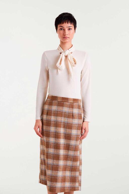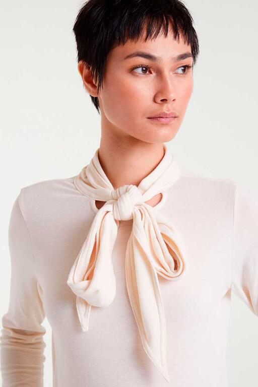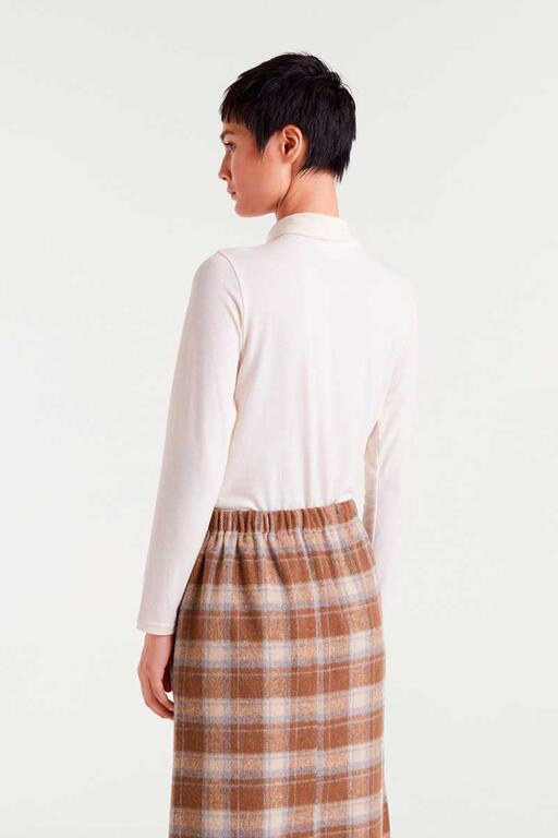 T-shirt bianco/panna in maglia leggera con scollo alto e maniche lunghe. La modella è alta 177 cm e indossa una taglia S.