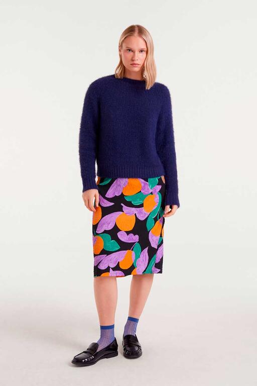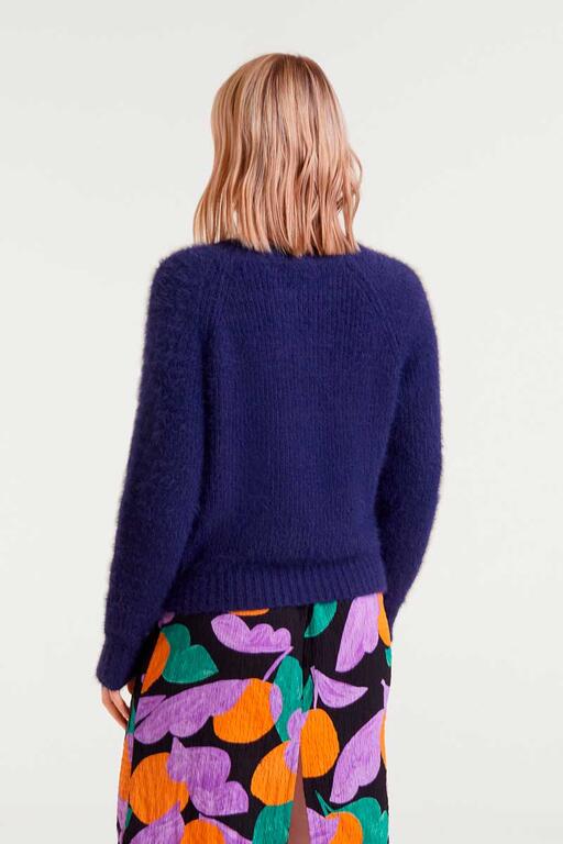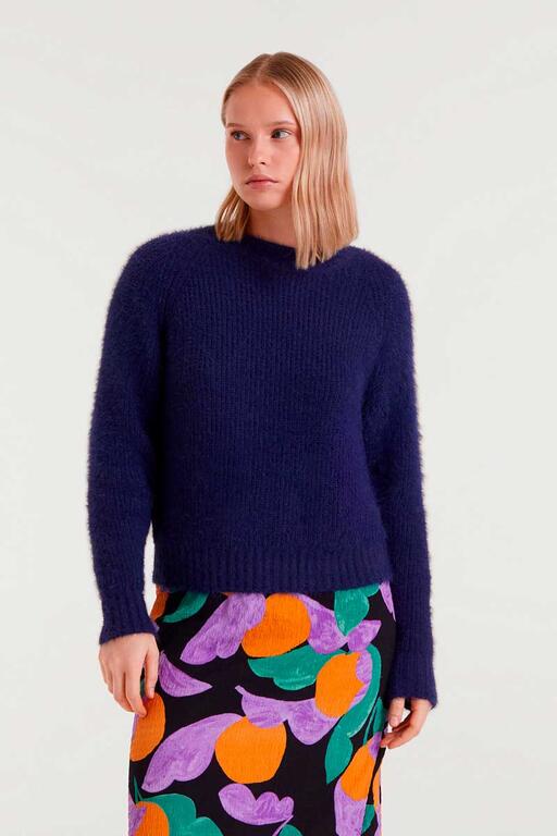 Maglione blu testurizzato in maglia con scollo rotondo e maniche lunghe. Dettagli a coste. La modella è alta 174 cm e indossa una taglia S.