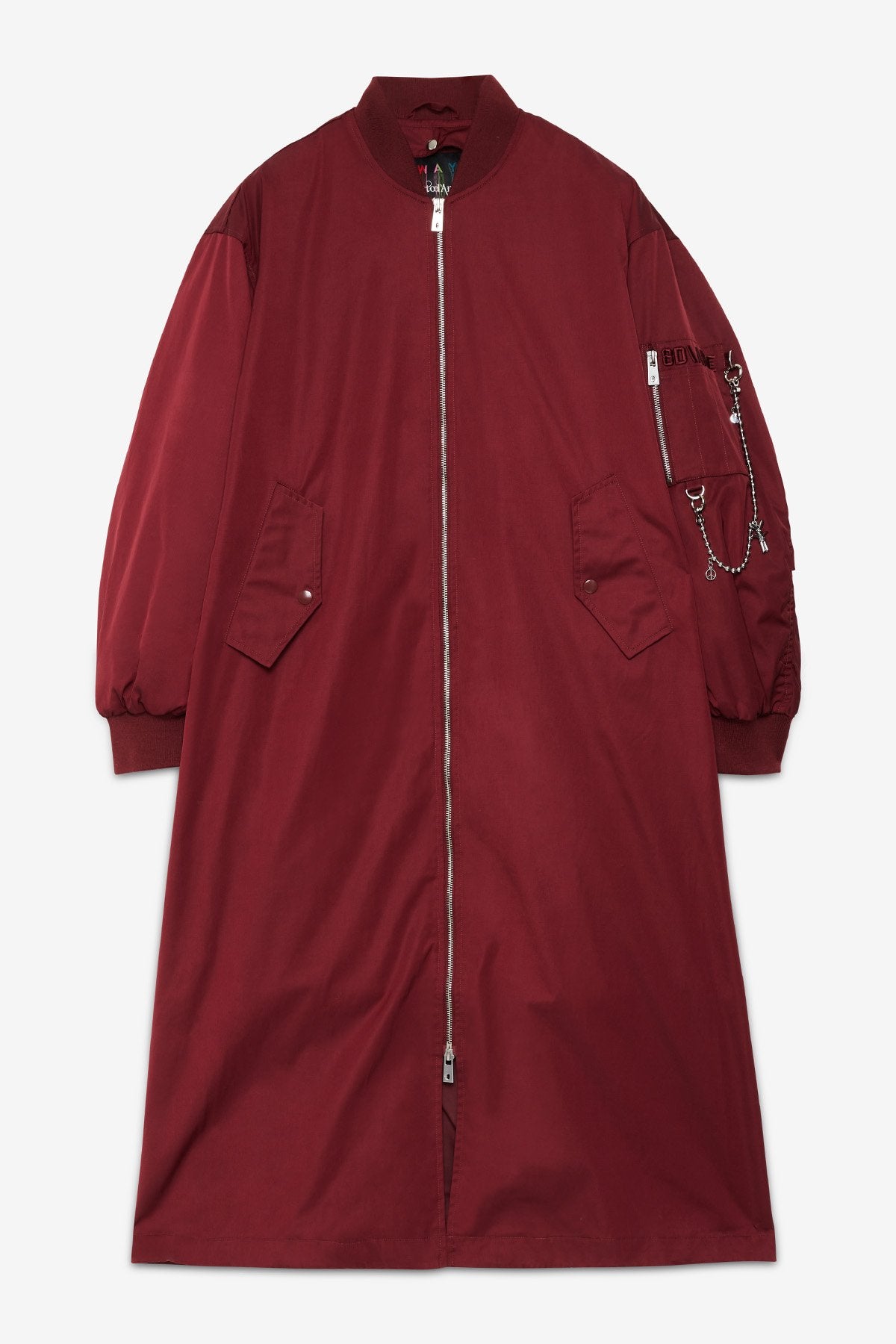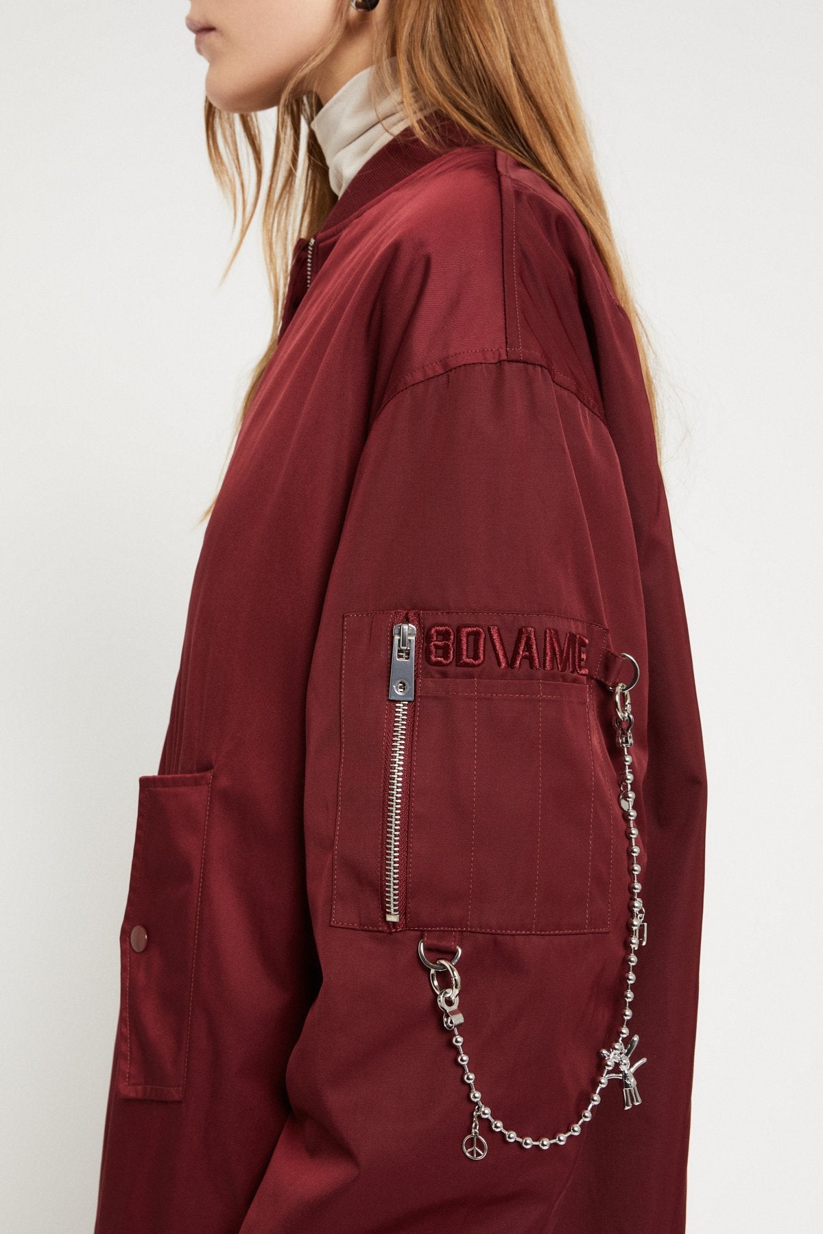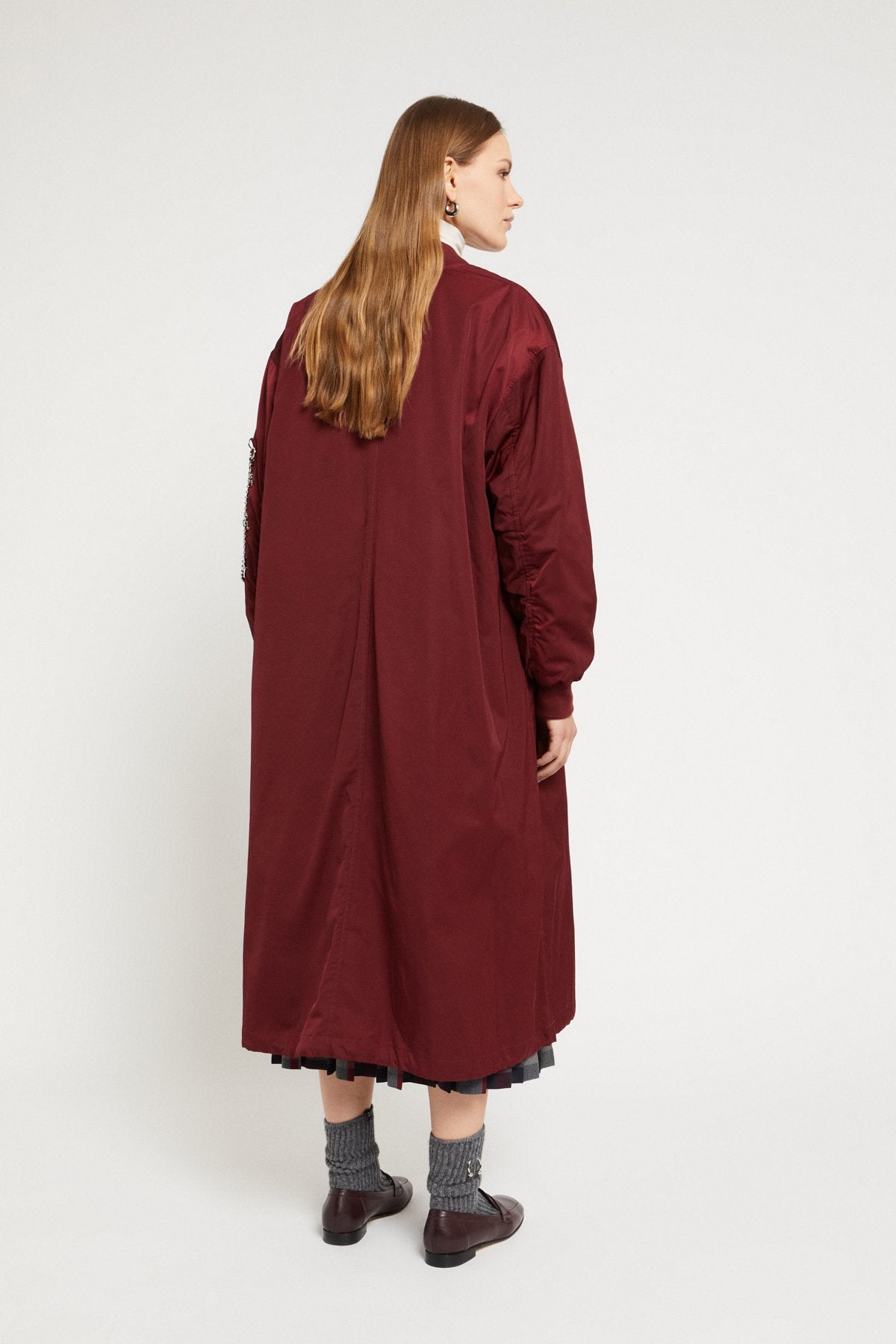 Bomber lungo, con zip, applicazione gioiello e interno imbottito staccabile. Vestibilità Oversize, Color rouge noire.