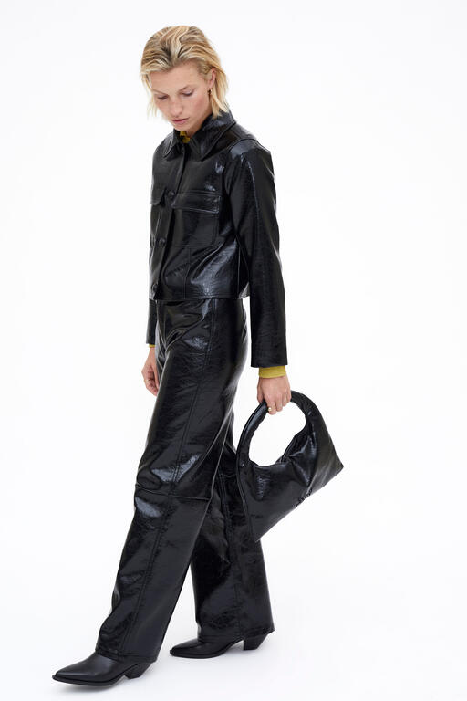 Borsa in simil pelle nera con manico e patta con calamita all'interno.