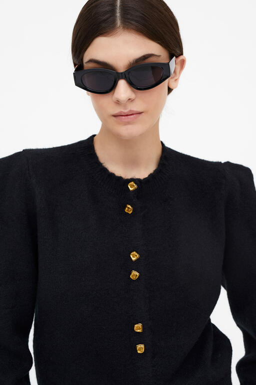 Cardigan nero in maglia. Scollo rotondo e maniche lunghe con dettagli a coste. Chiusura con bottoni gioielli dorati.