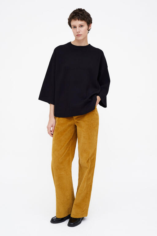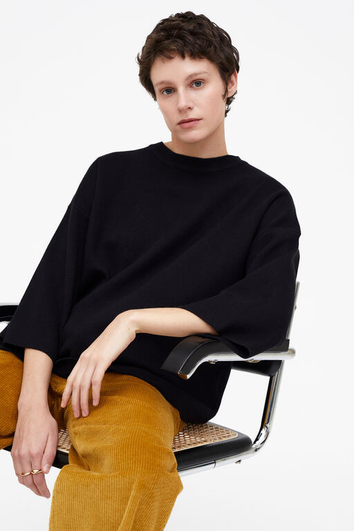 Maglione nero a maniche lunghe in maglia fine, con scollo rotondo e ampie maniche alla francese con spalle scese.
