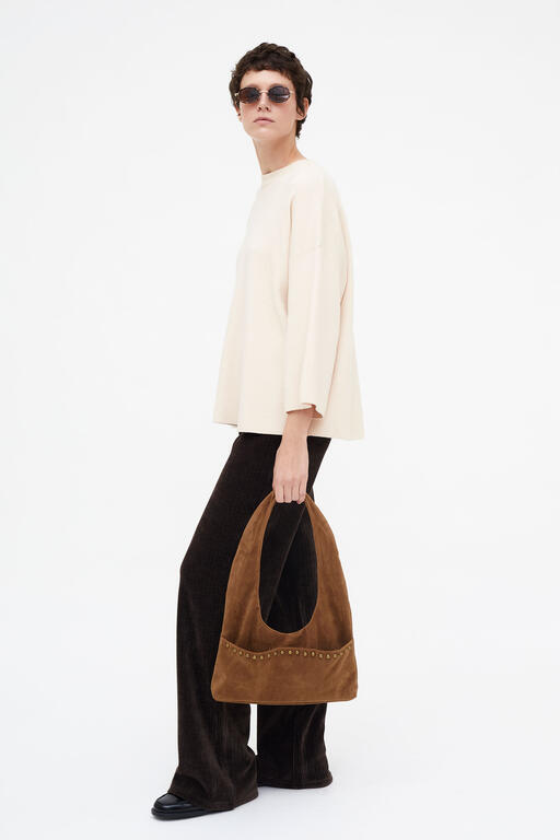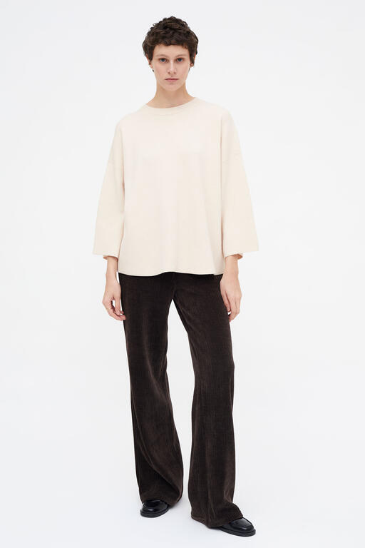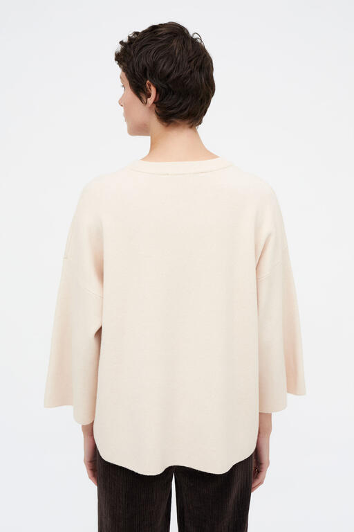 Maglione bianco/ panna a maniche lunghe in maglia fine, con scollo rotondo e ampie maniche alla francese con spalle scese.