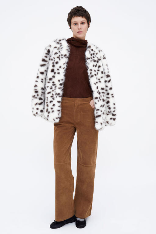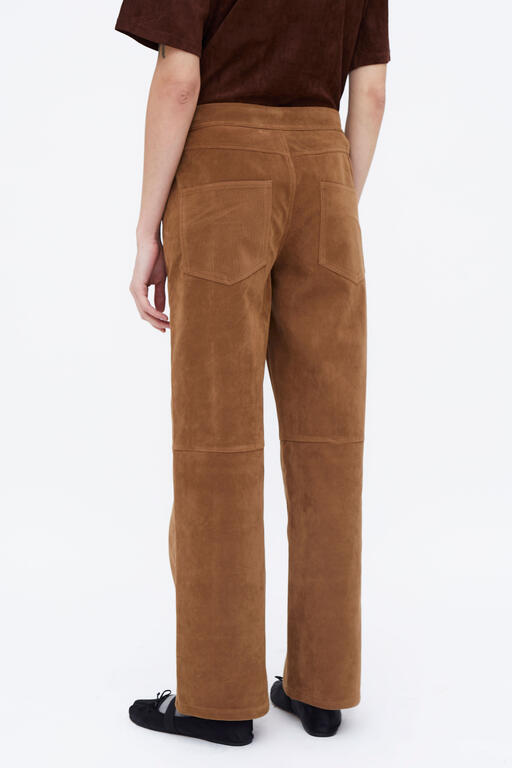Pantaloni dritti effetto camoscio color cammello, vita media e fissa. Chiusura con piega nascosta sul davanti. Tasche laterali e posteriori.